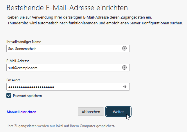 Beim ersten Anlegen öffnet sich ein Assistent. Wenn Sie die ersten Daten eingetragen haben, versucht Thunderbird, Zugangsdaten vorzuschlagen – am besten auf „manuell“ stellen und die Daten dann ähnlich wie hier gezeigt eintragen.