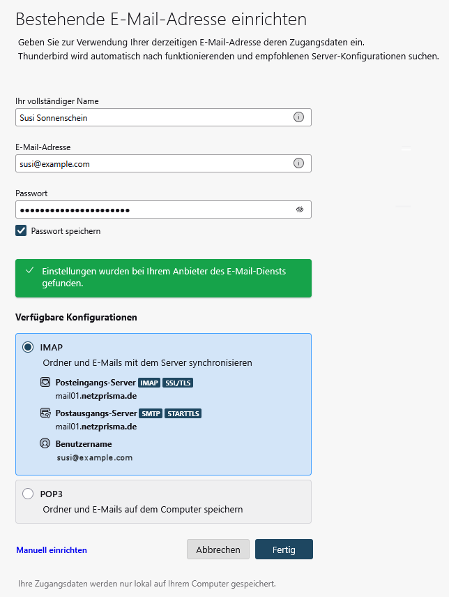 Thunderbird sollte nun direkt Zugangsdaten für Ihre Maildomain finden – nach Bestätigung stehen sie im Dialog und man wählt für das Mailkonto, ob es als pop3- oder, sofern für die Maildomain gebucht, als imap-Mailkonto angelegt werden soll..